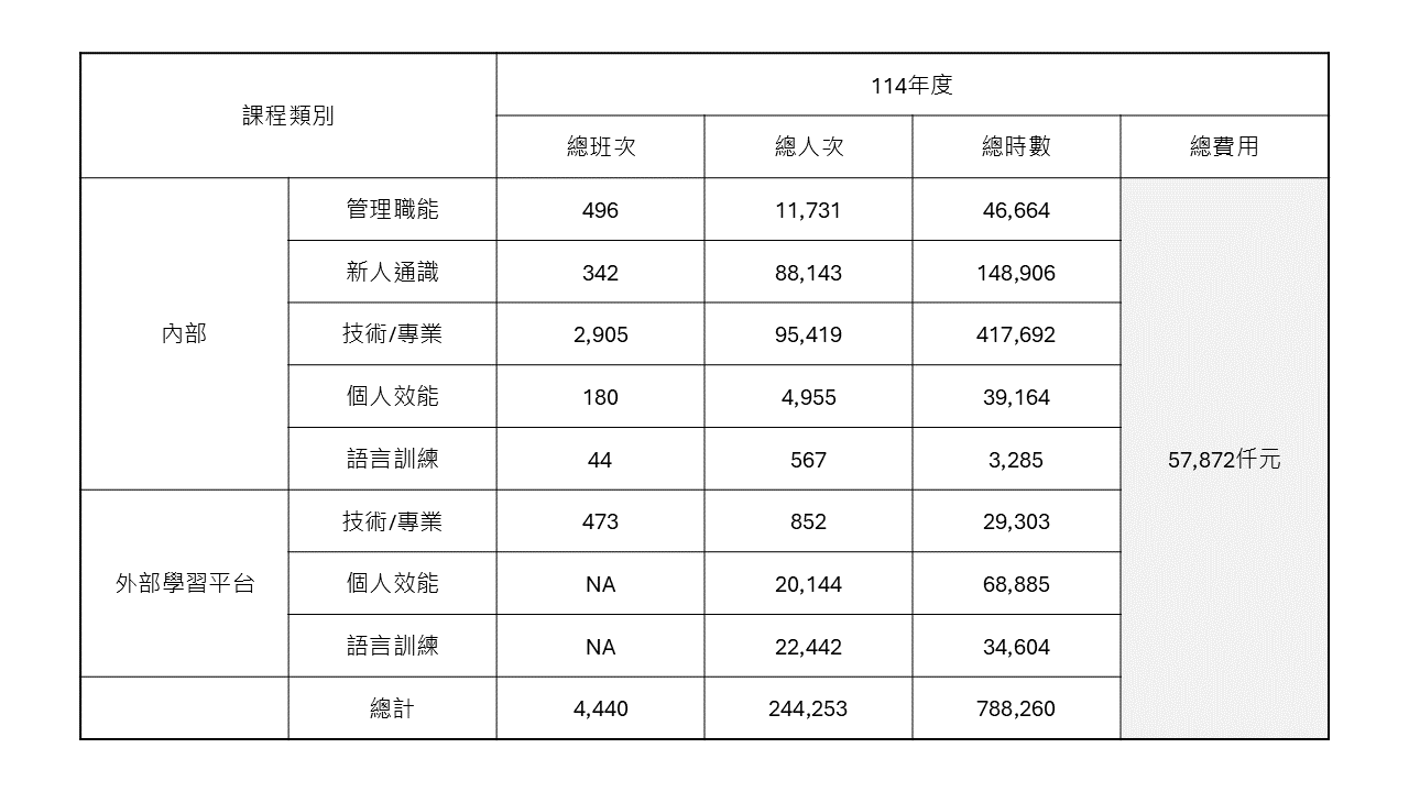 2024 年全球教育訓練,包含線上與教室課程總時數達逾 78 萬小時,共計超過 2 萬名員工參與課程,平均每位達 40 小時。